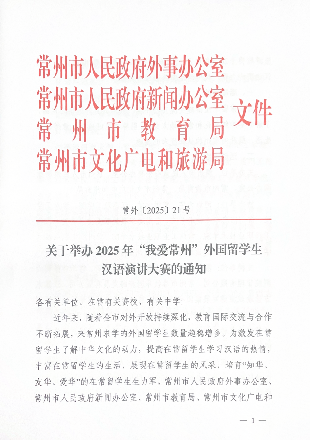 2025年“我爱常州”外国留学生汉语演讲大赛由常州市人民政府外事办公室、常州市人民政府新闻办公室、常州市教育局、常州市文化广电和旅游局四部门联合主办,河海大学、常州大学、江苏理工学院、常州工学院等10所在常高校和常州国际人才交流中心协办。大赛分10所高校和市教育局(中学组)共11个赛区进行初赛,获得初赛一等奖的选手将参加12月18日在常州大学西太湖校区举行的全市总决赛。