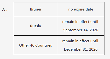 答:目前,中方对文莱持普通护照人员的免签政策未设施行期限,对俄罗斯持普通护照人员的免签政策施行至2026年9月14日,对其余46国持普通护照人员的免签政策施行至2026年12月31日。