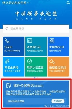 为充分发挥信息化手段优势,进一步帮助海外中国公民更好获得领事保护与服务,外交部“中国领事”APP推出“海外公民登记”功能模块并已全面上线。中国驻特多使馆提醒在特多中国公民: