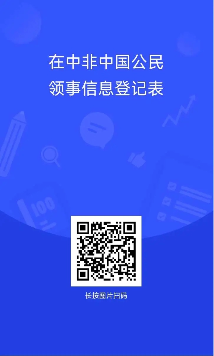 根据《中华人民共和国领事保护与协助条例》和使馆领保工作需要,中国驻中非大使馆谨提醒在中非的中国有关机构、企业、人员务必在使馆信息登记平台上预先登记基本信息(领事报备二维码后附)。