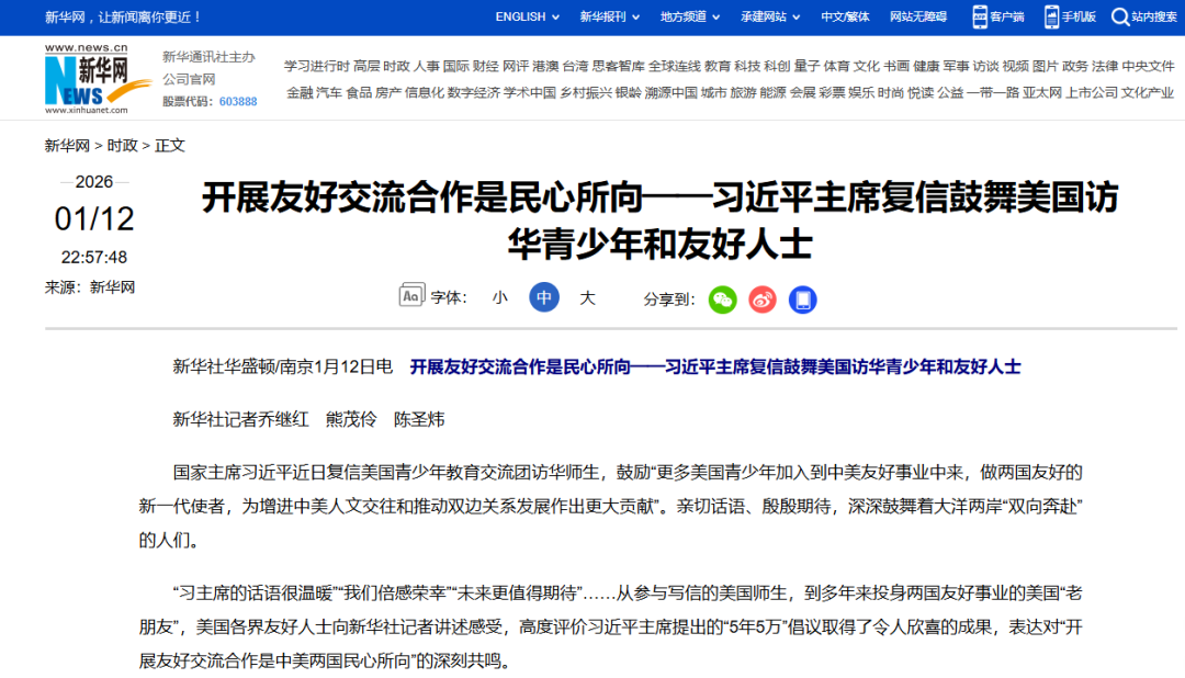 1月12日,新华社播发通讯《开展友好交流合作是民心所向——习近平主席复信鼓舞美国访华青少年和友好人士》。