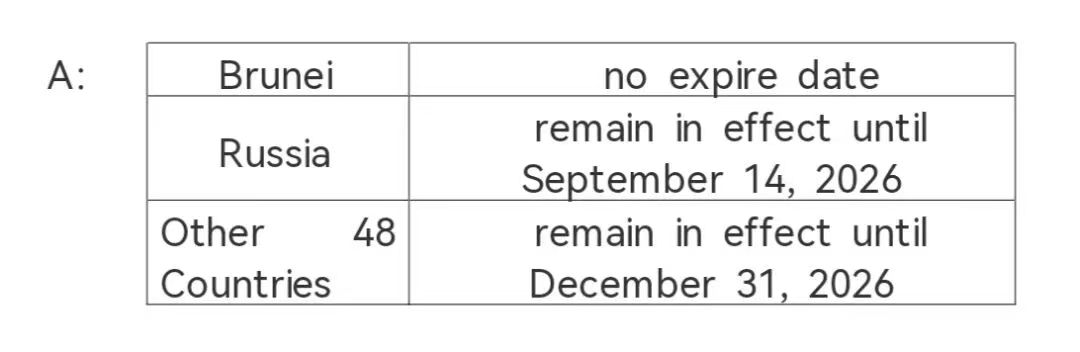 答:目前,中方对文莱持普通护照人员的免签政策未设施行期限,对俄罗斯持普通护照人员的免签政策施行至2026年9月14日,对其余48国持普通护照人员的免签政策施行至2026年12月31日。